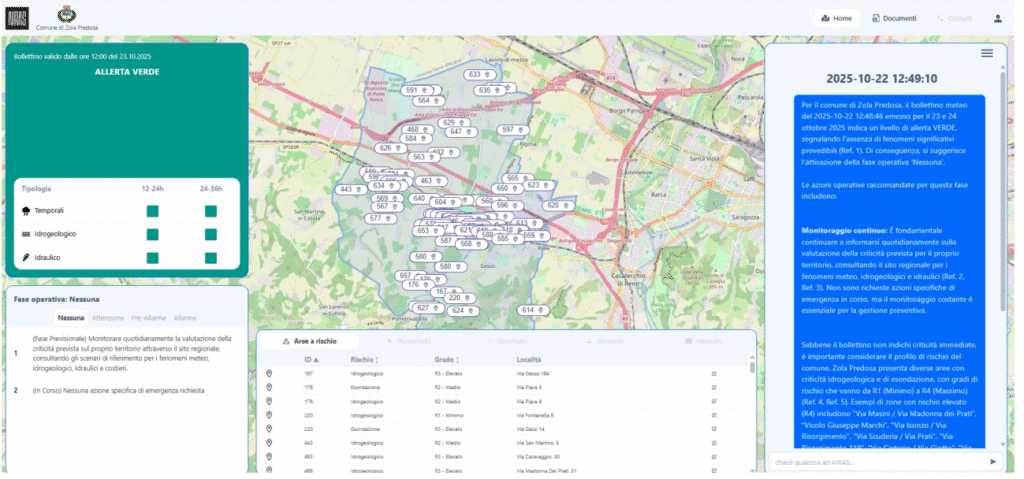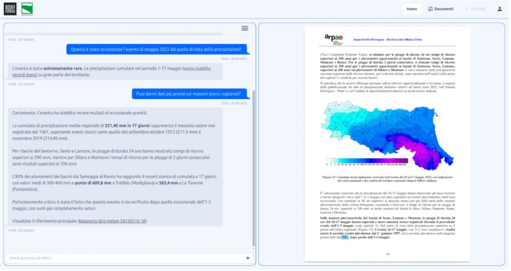 • Livello Macro: A livello macro, AIRAS offre diversi agenti conversazionali che permettono all’utente di consultare ed incrociare documentazione e dati, attuali e storici, inerenti eventi meteorologici avversi riferiti ad un territorio, azioni messe in atto per mitigare gli effetti di questi eventi e in generale la gestione delle emergenze climatiche.